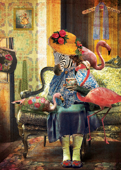 Gezellige Ansichtkaart van een Zebra-vrouwtje op de bank met haar Flamingo's.
