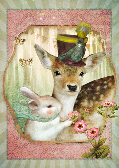 Lieve Ansichtkaart van een Knuffelend Hertje en Konijntje.