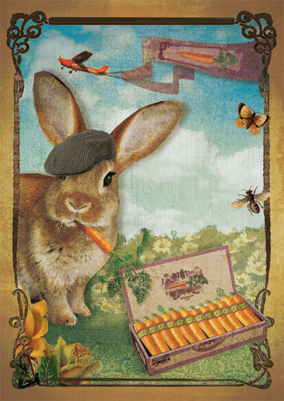 Grappige Ansichtkaart van een Konijn met een doos Wortels.