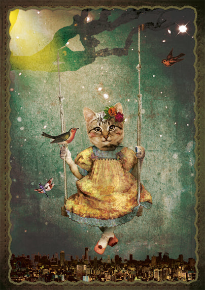 Dromerige Ansichtkaart van een Schommelend Poesje in het maanlicht.