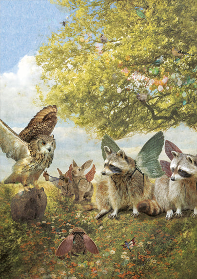 Ansichtkaart van een Uil die in het bos Vliegles geeft.