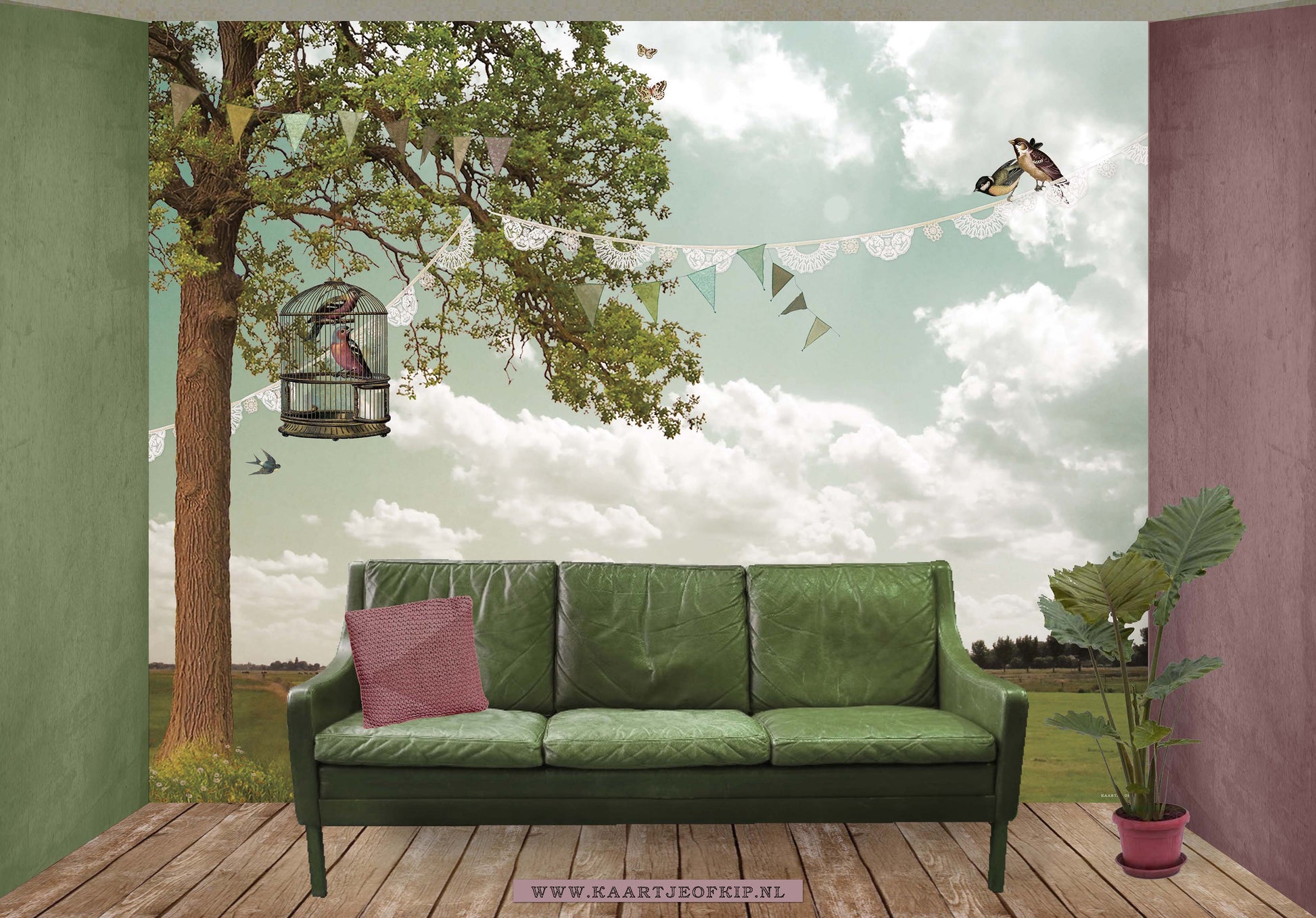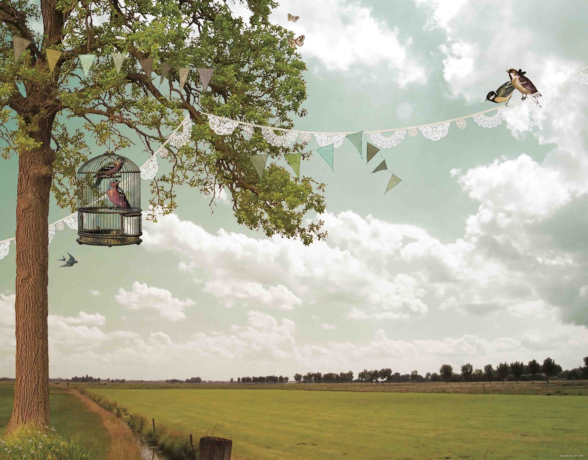 Misschien goed om te weten: De sprookjesachtige plaatjes van Kaartje of Kip komen tot stand door tekeningen en bewerkte foto's met elkaar te combineren. De afbeelding op het behang is speciaal als behang ontworpen, maar wees u bewust dat de "collage techniek" op het formaat van behang, duidelijker zichtbaar is dan op een ansichtkaart. Ook maakt Kaartje of Kip gebruik van filters waarmee de afbeelding een mooie warme uitstraling krijgt. Hierdoor zult u ook op het behang vrijwel geen effen kleuren tegenkomen en is de achtergrond aan de randen soms donkerder van kleur dan in het midden van de muur. Dit alles zorgt ervoor dat het behang van Kaartje of Kip van iedere muur en ruimte écht iets bijzonders maakt!