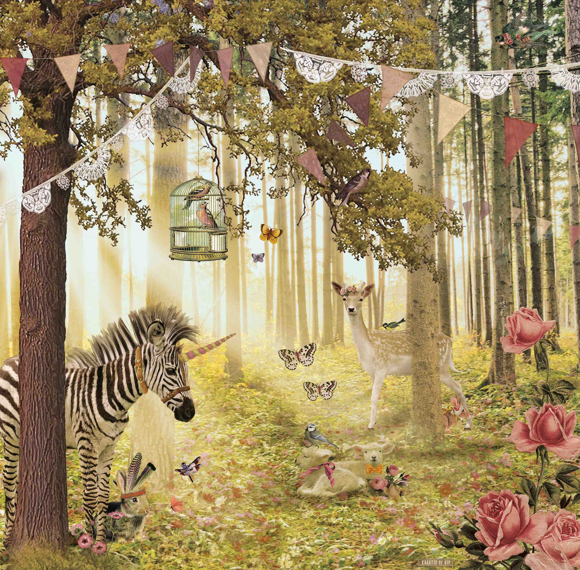 Misschien goed om te weten: De sprookjesachtige plaatjes van Kaartje of Kip komen tot stand door tekeningen en bewerkte foto's met elkaar te combineren. De afbeelding op het behang is speciaal als behang ontworpen, maar wees u bewust dat de "collage techniek" op het formaat van behang, duidelijker zichtbaar is dan op een ansichtkaart. Ook maakt Kaartje of Kip gebruik van filters waarmee de afbeelding een mooie warme uitstraling krijgt. Hierdoor zult u ook op het behang vrijwel geen effen kleuren tegenkomen en is de achtergrond aan de randen soms donkerder van kleur dan in het midden van de muur. Dit alles zorgt ervoor dat het behang van Kaartje of Kip van iedere muur en ruimte écht iets bijzonders maakt!