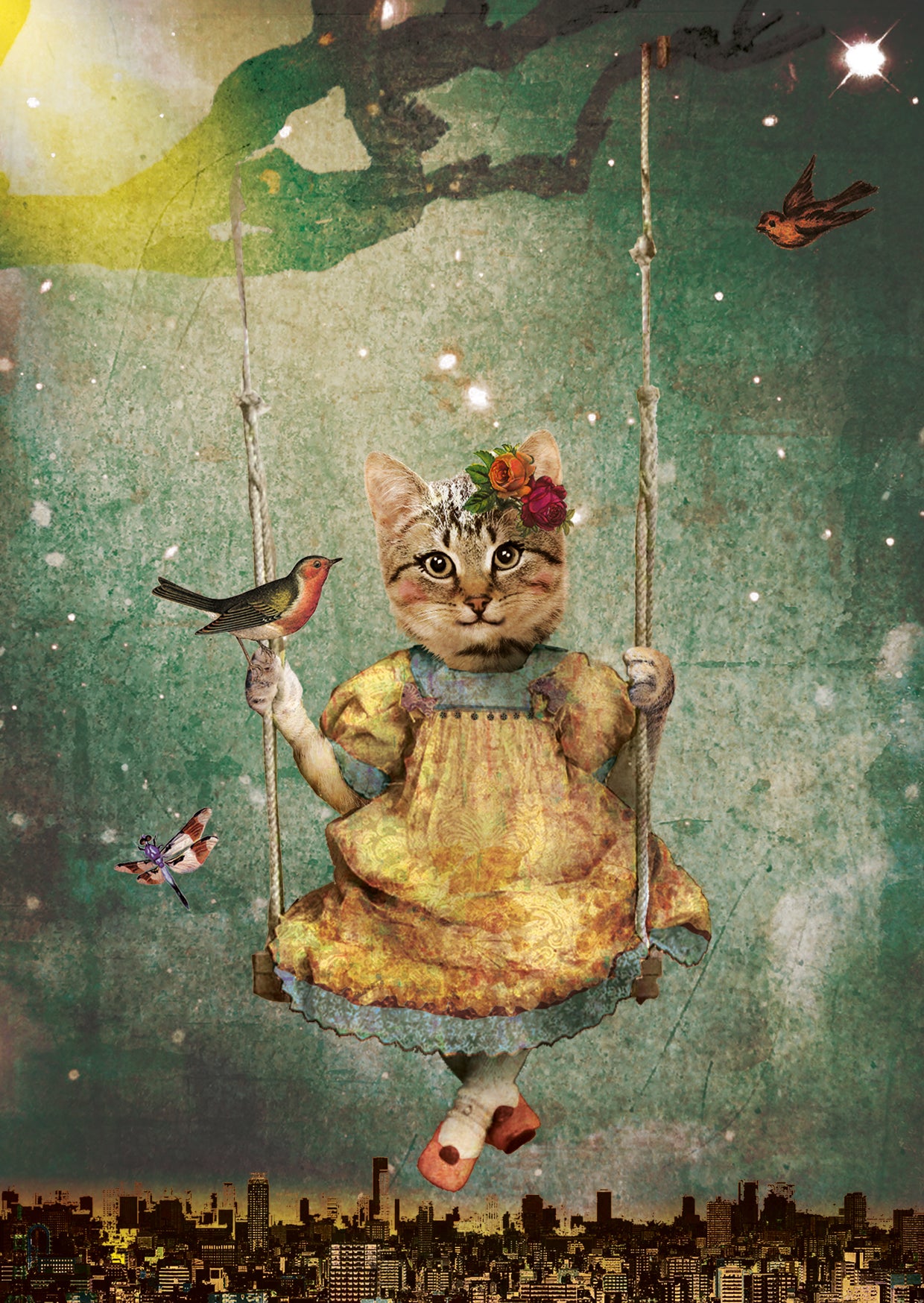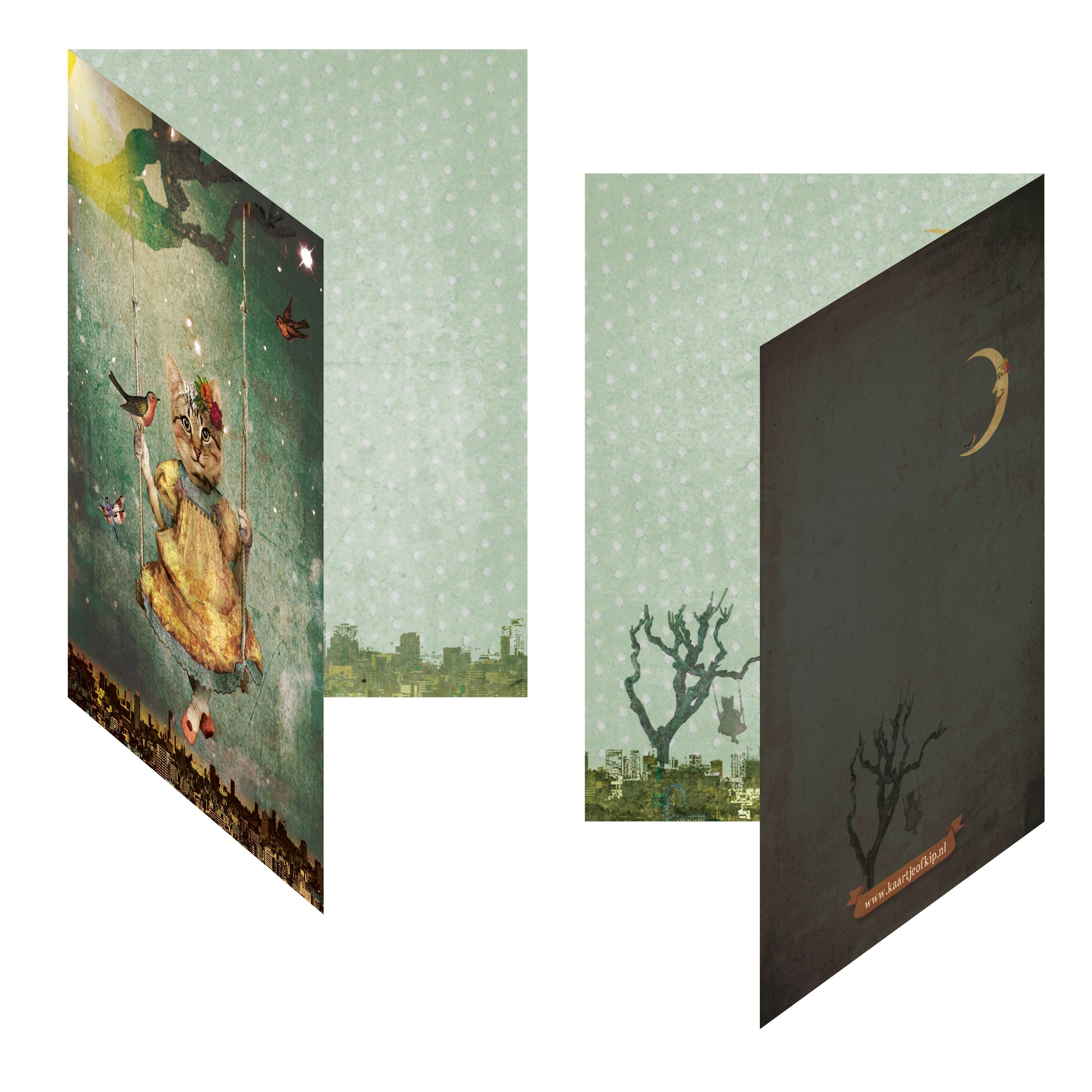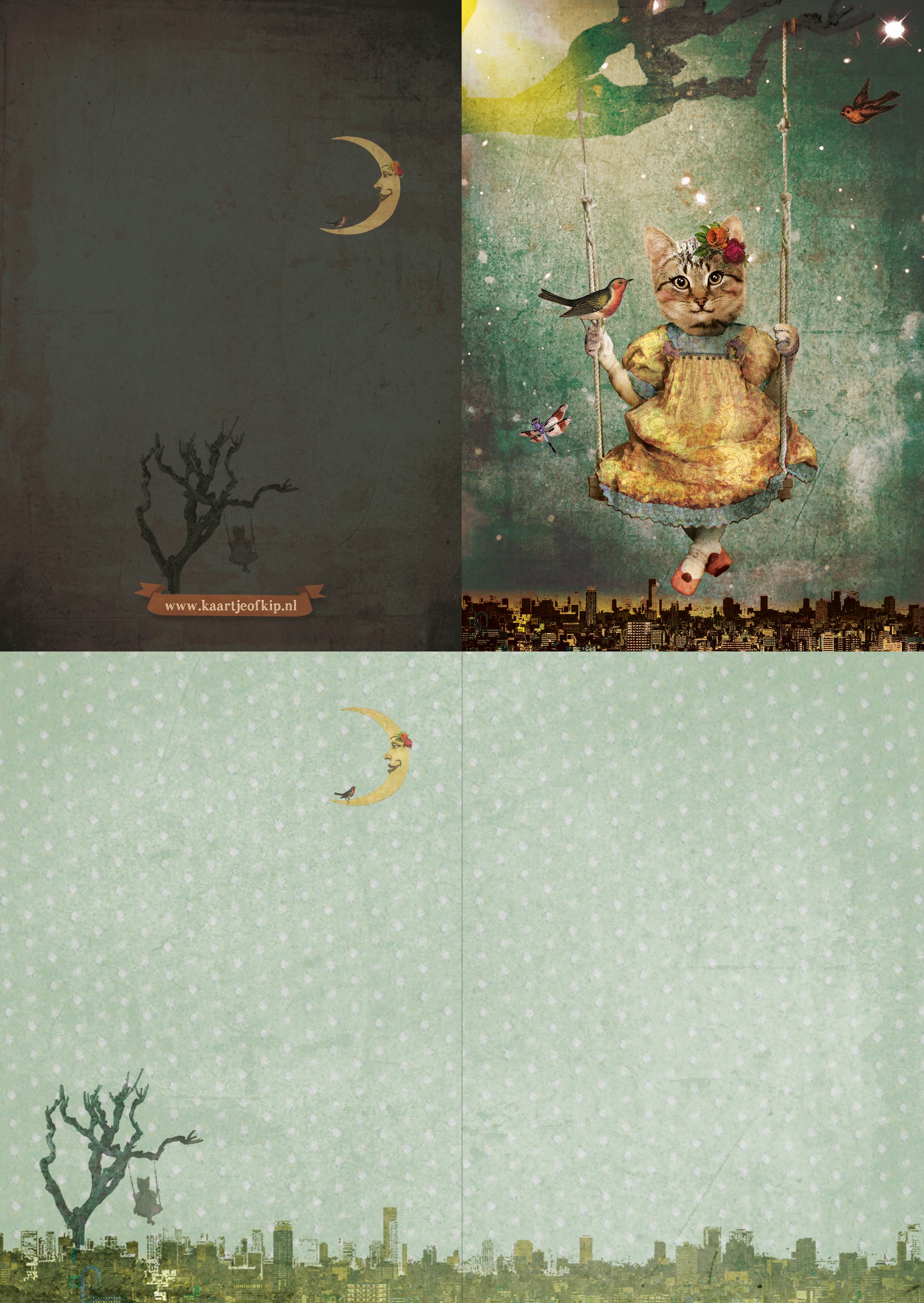 Sprookjesachtige luxe gevouwen kaart van een Poesje op de Schommel onder het maanlicht. Mooi aan de buiten én binnenkant & inclusief envelop*.