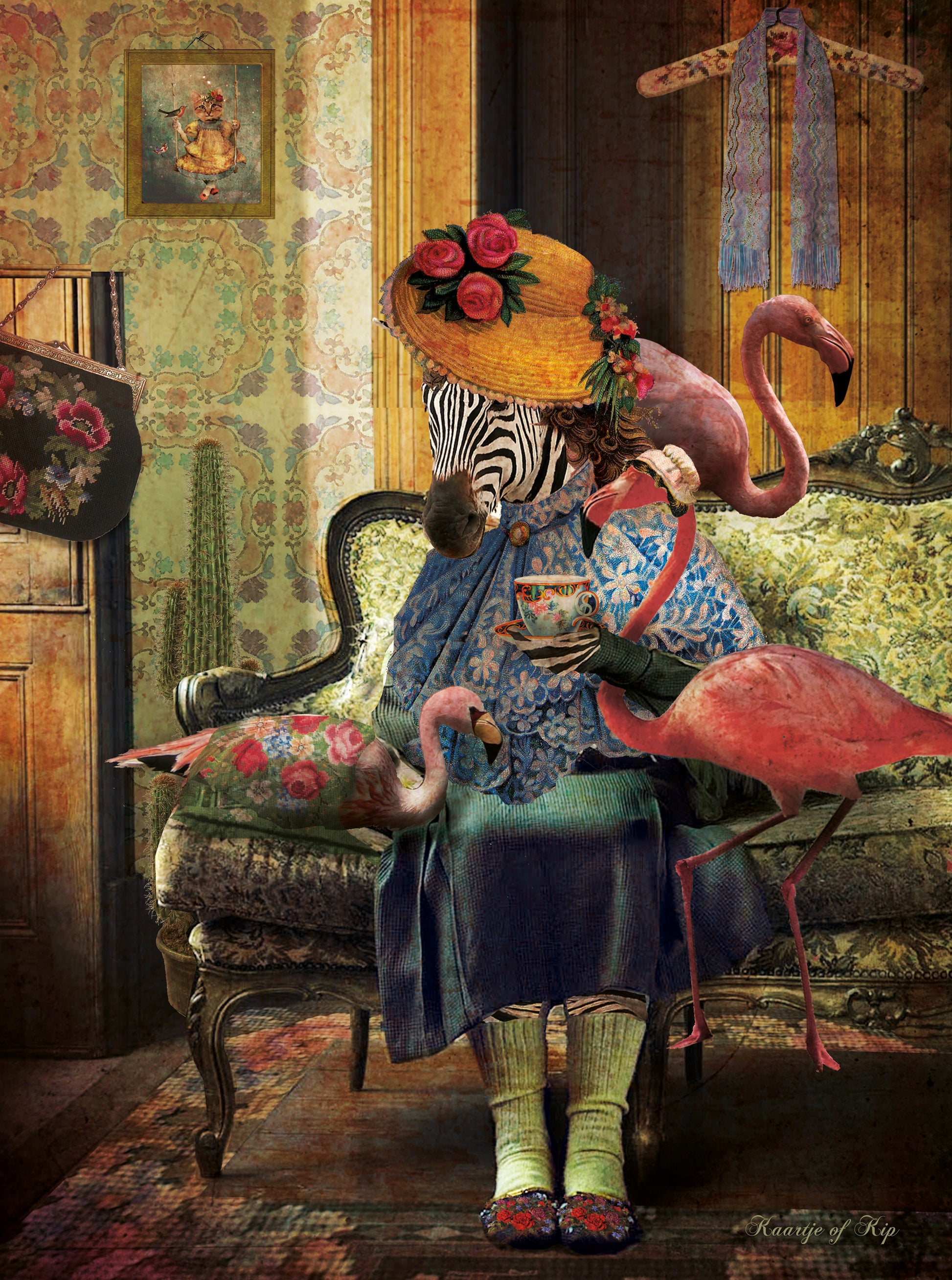 Sfeervolle poster van een Zebravrouwtje met haar Flamingo's op de bank.