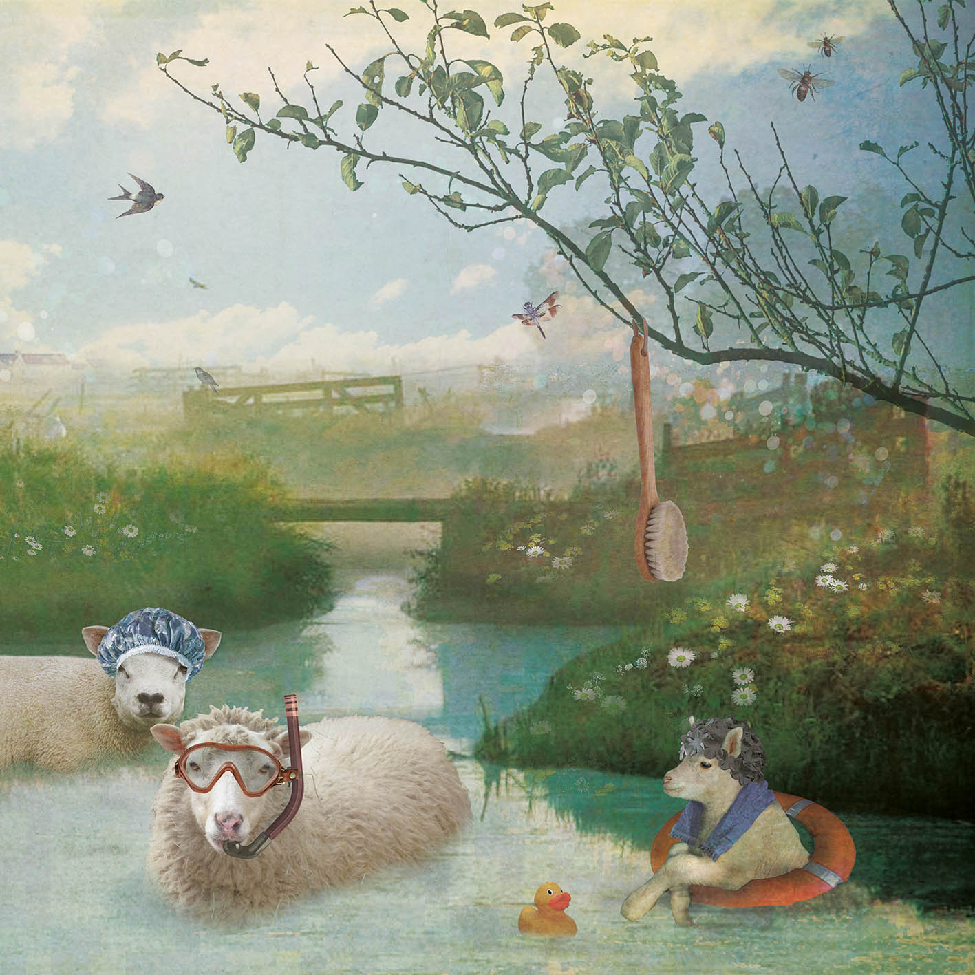 Gezellige, zwemmende Schapen op PVC (510 g/m²) brandwerend, waterafstotend en gedrukt met UV inkt.